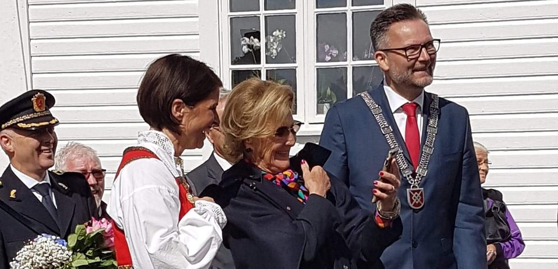 Hennes Majestet Dronning Sonja besøkte Skudeneshavn og prøvde "Tilbakeblikk", Visit Karmøys byguide laget med Forum.